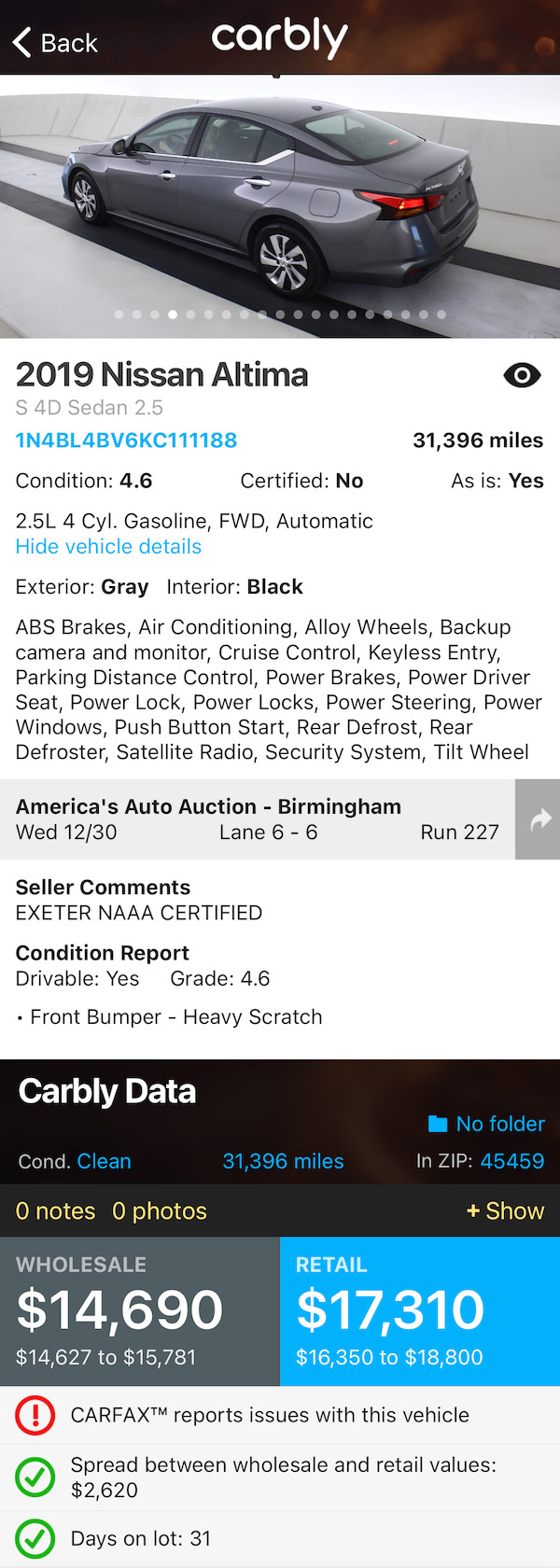 Dealers can follow sales by clicking into the lane in the Carbly app or scanning a VIN to return auction listing info. Every vehicle also has Carbly